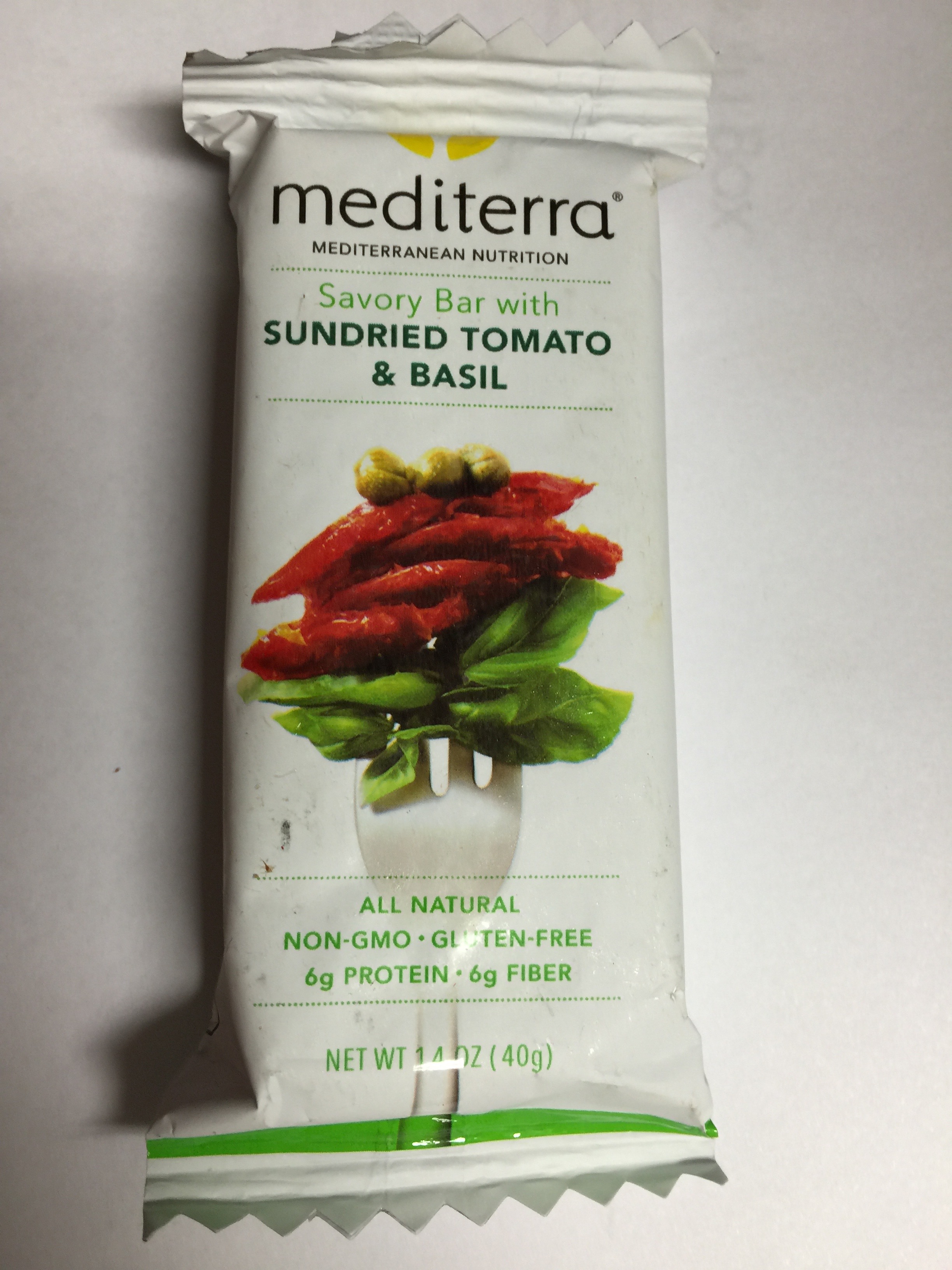 Looked forward to trying this nutrition bar as I am a major fan of sun dried tomatoes and basil. This bar felt like it was a meal in each bite. There was a nutty texture and it smelled like dinner. I gave a bite to my brother and did not tell him what he was. He was surprised as he thought the sun dried tomatoes were chocolate! I enjoyed this because I am not a fan of sweet things and love the main ingredients.