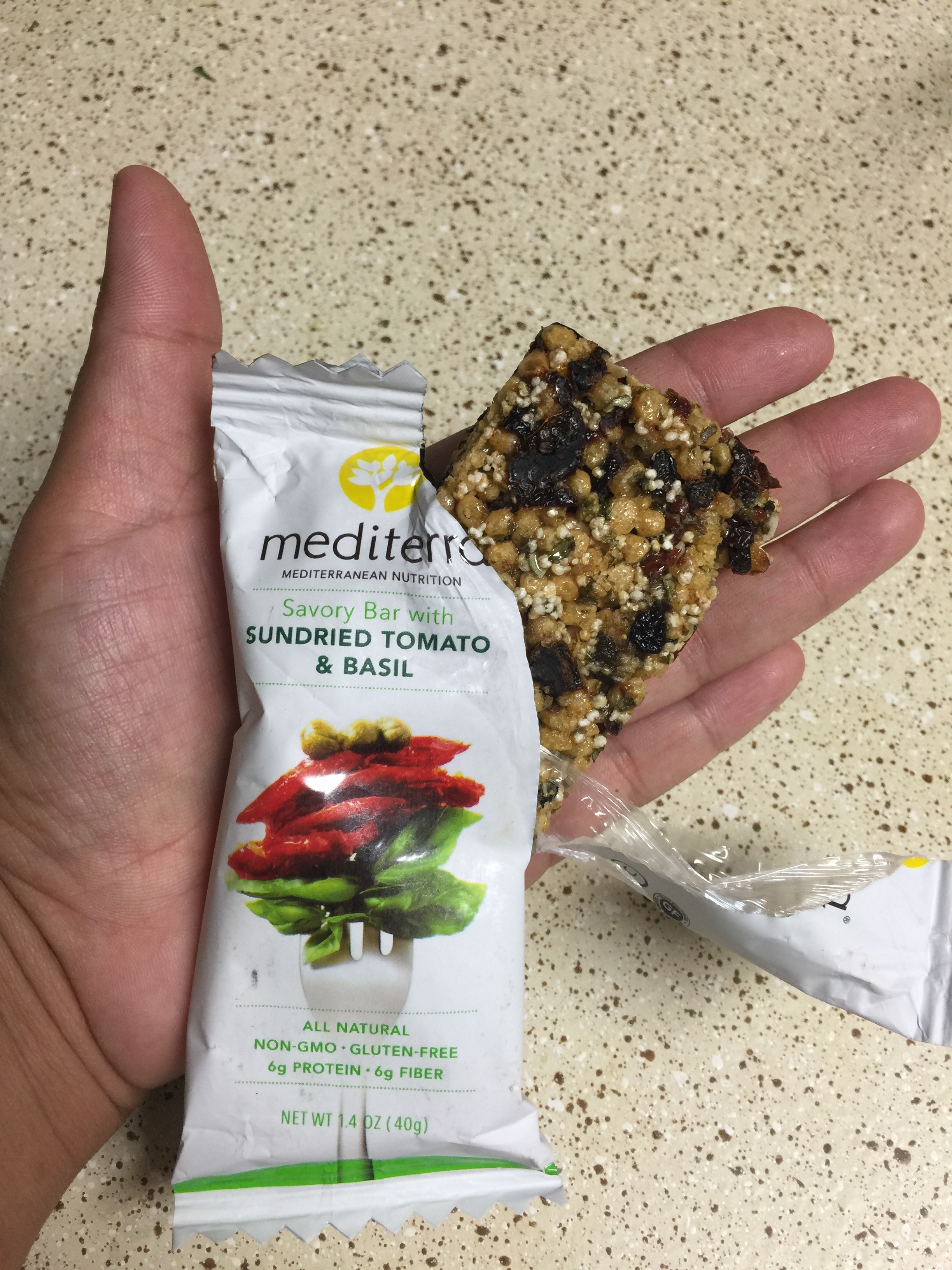 Looked forward to trying this nutrition bar as I am a major fan of sun dried tomatoes and basil. This bar felt like it was a meal in each bite. There was a nutty texture and it smelled like dinner. I gave a bite to my brother and did not tell him what he was. He was surprised as he thought the sun dried tomatoes were chocolate! I enjoyed this because I am not a fan of sweet things and love the main ingredients.